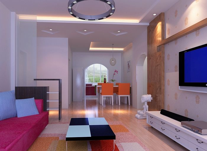 整个客厅的面积有些紧凑,墙面刷上乳胶漆,进行了造型简洁的吊顶设计,顶利用多盏射灯来为空间提供照明,配合吊顶中的筒灯和隐藏式灯带,渲染出的家居氛围十分温馨又不乏时...